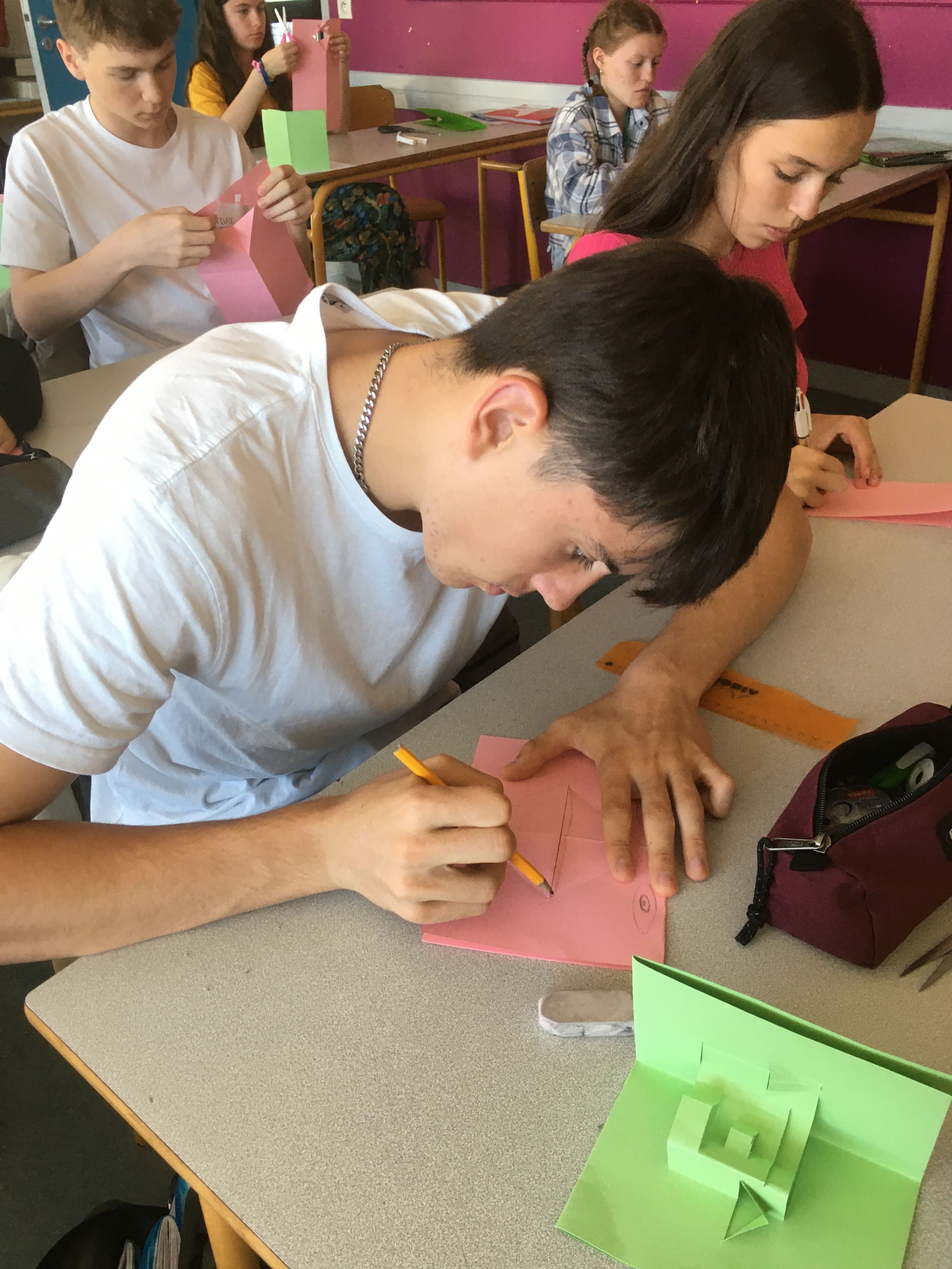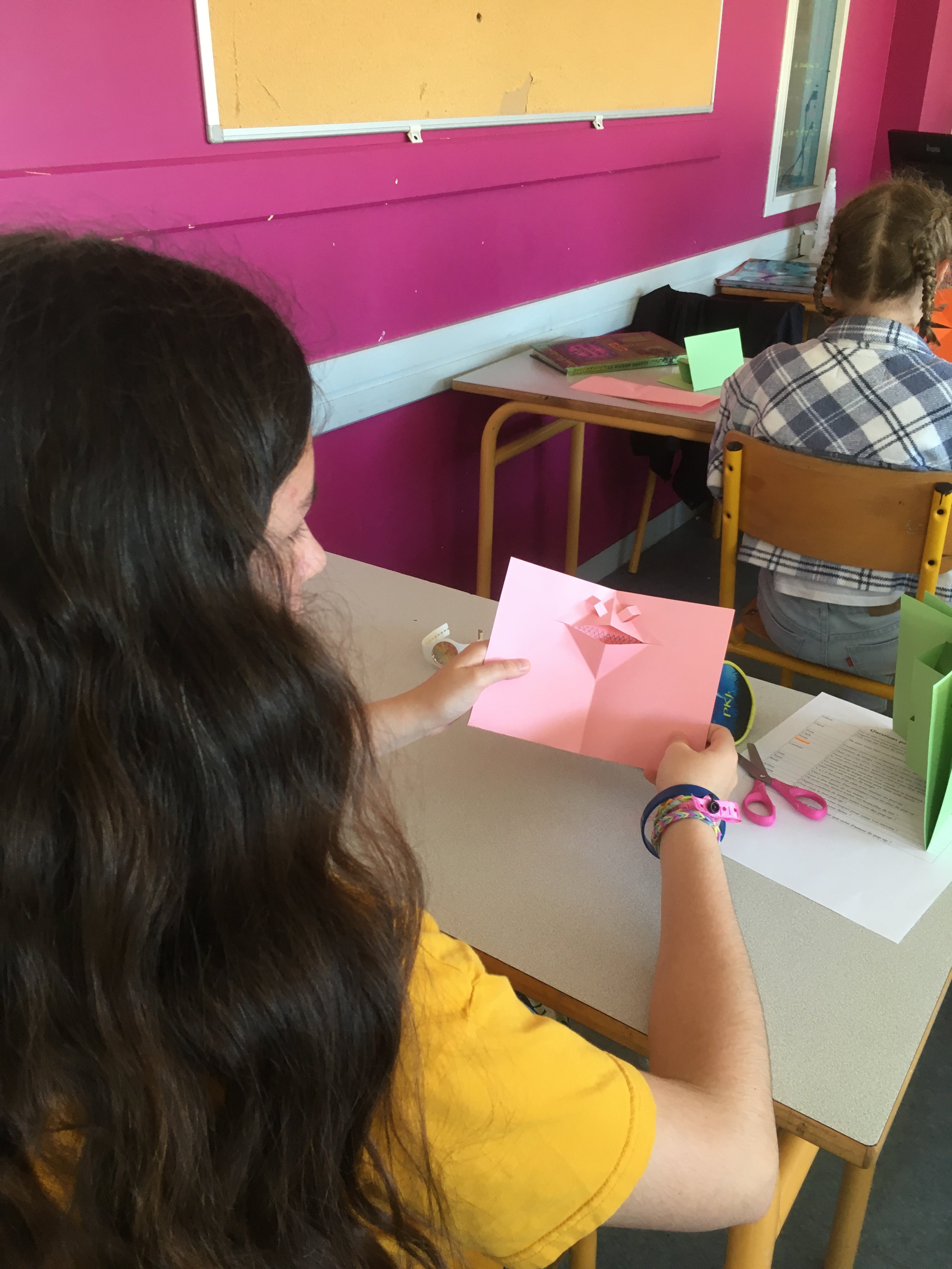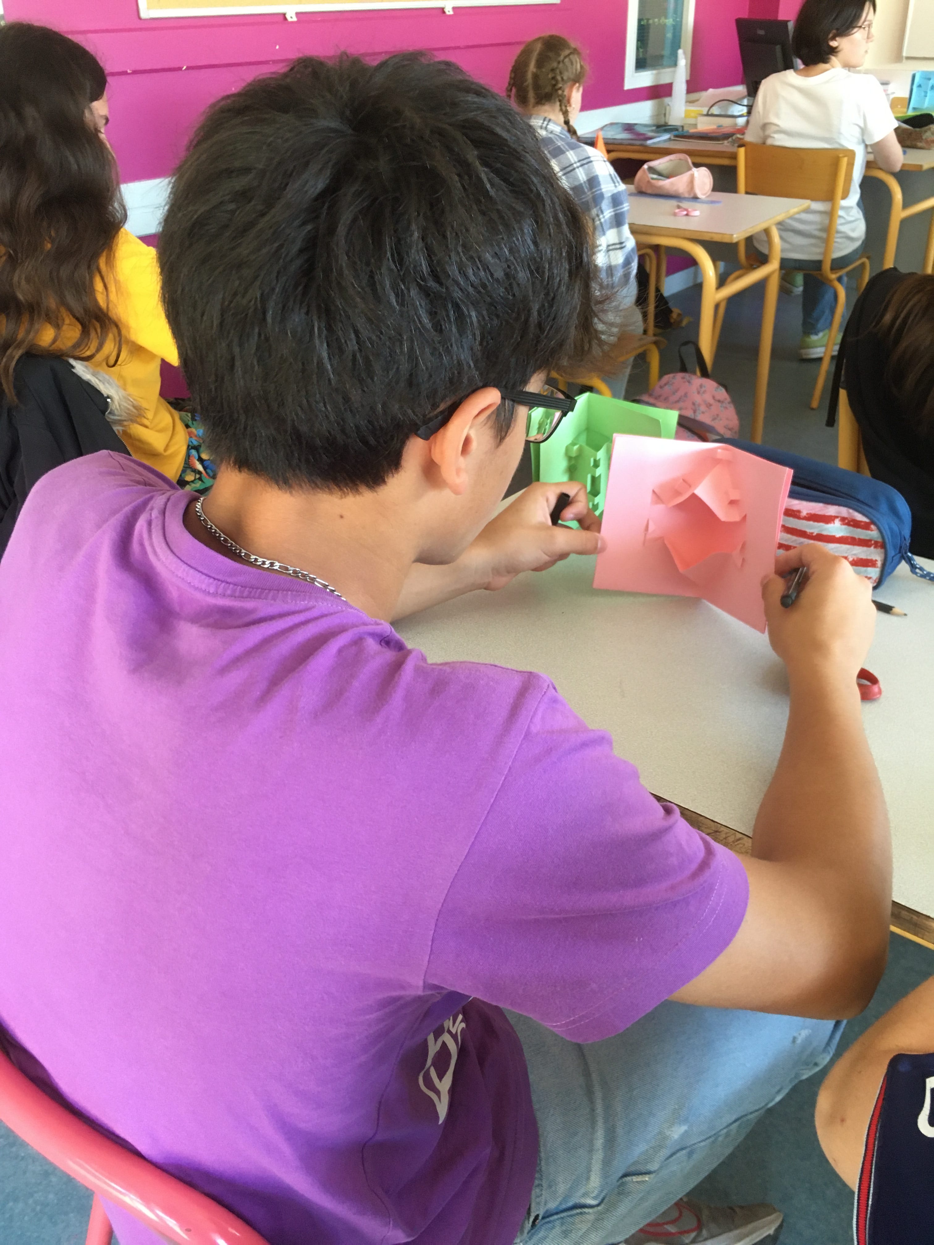L’échange riche et animé a été suivi par un atelier ludique pour fabriquer une carte pop-up. L’occasion pour les élèves de laisser parler leur imagination et leur créativité. Les ciseaux ont sculpté maison, bateau, cerf, bonhomme de neige, cœur, sapin de Noël et volcan.