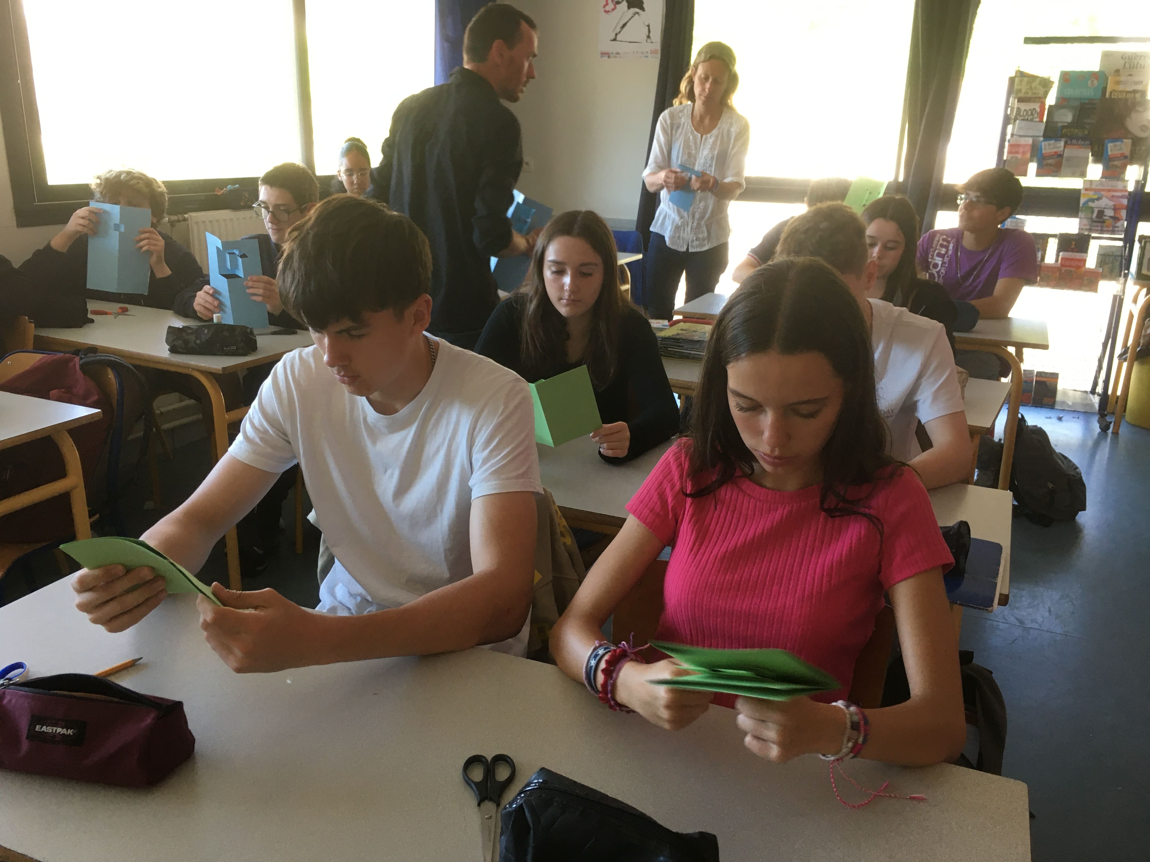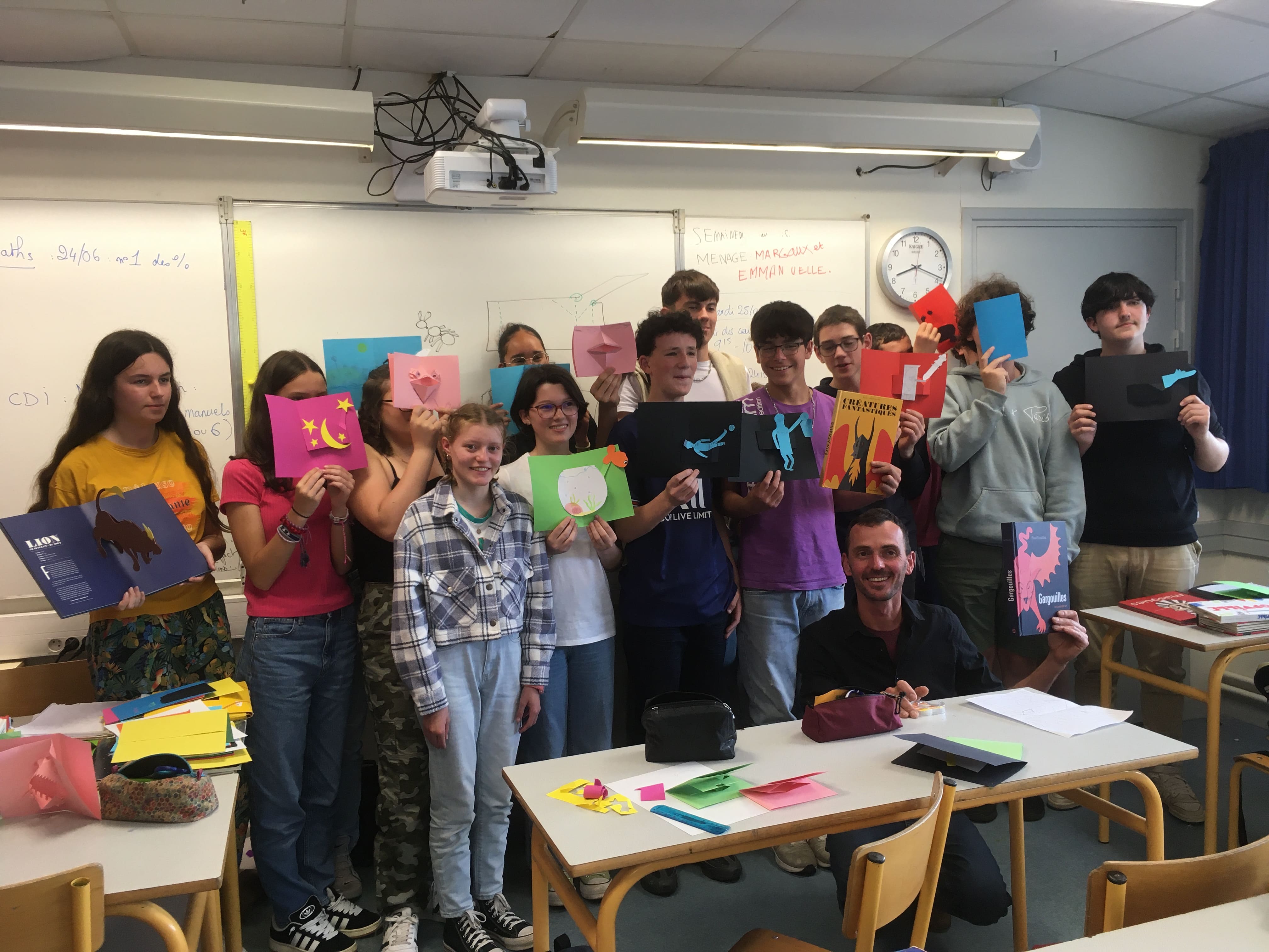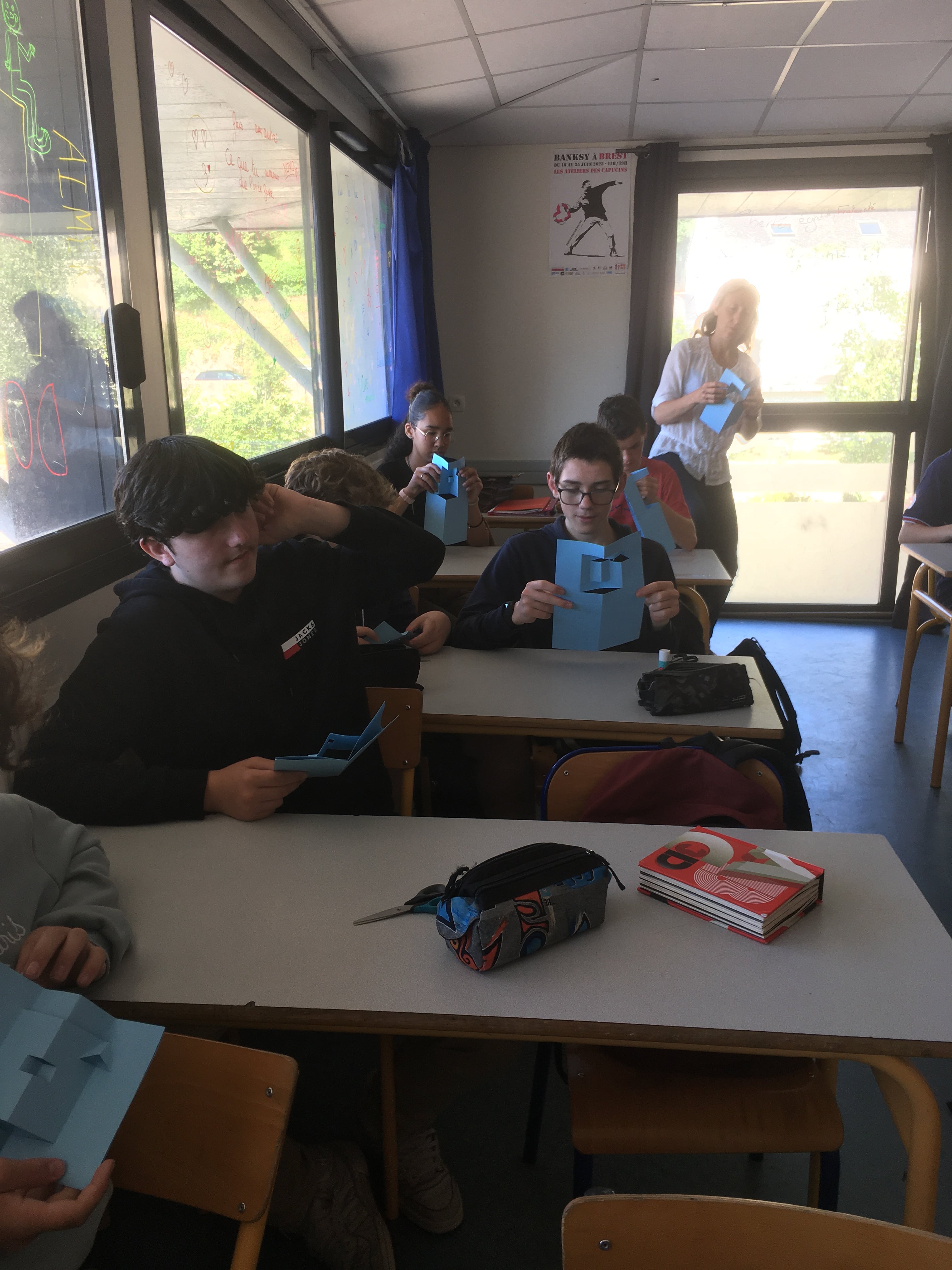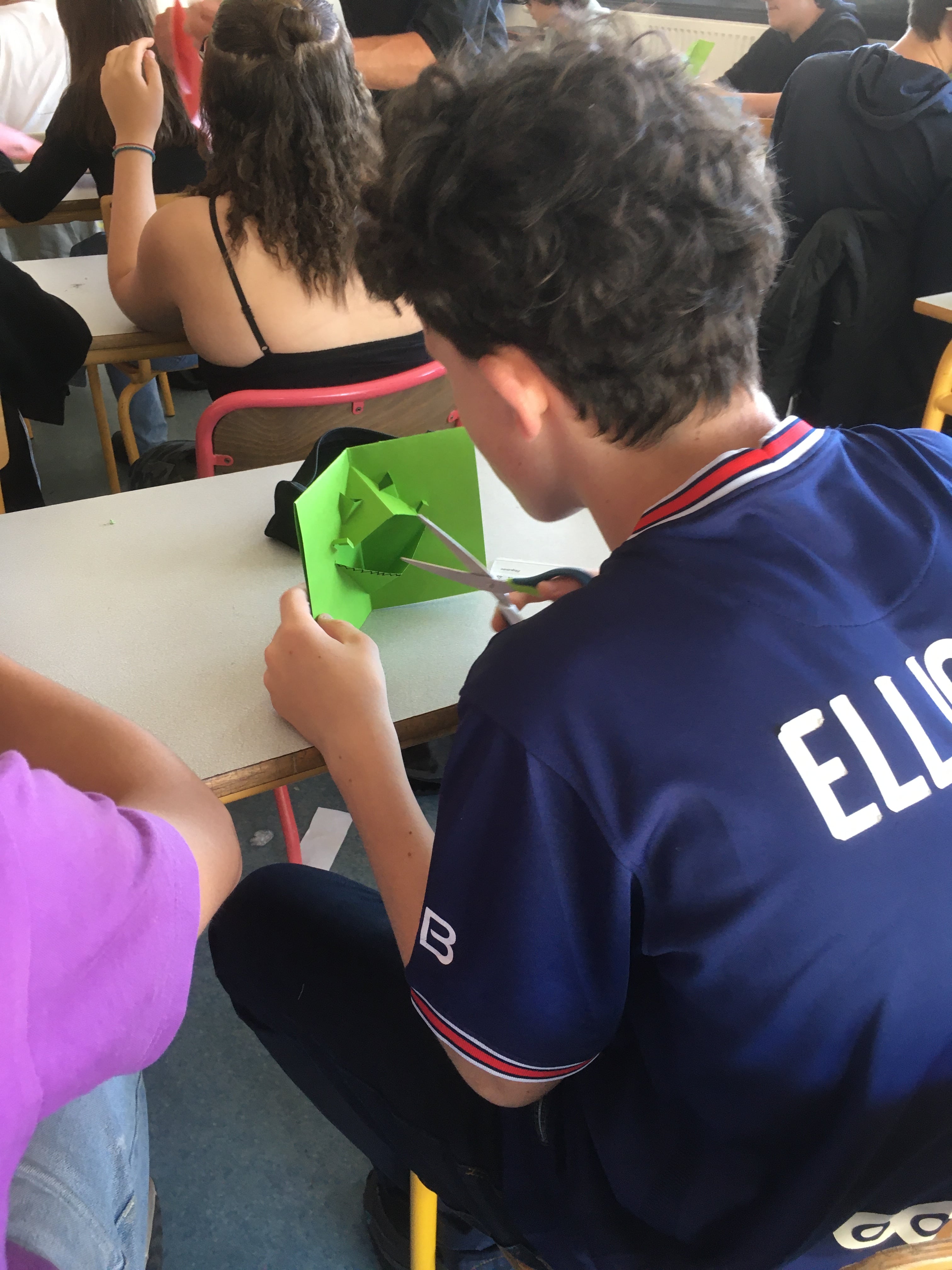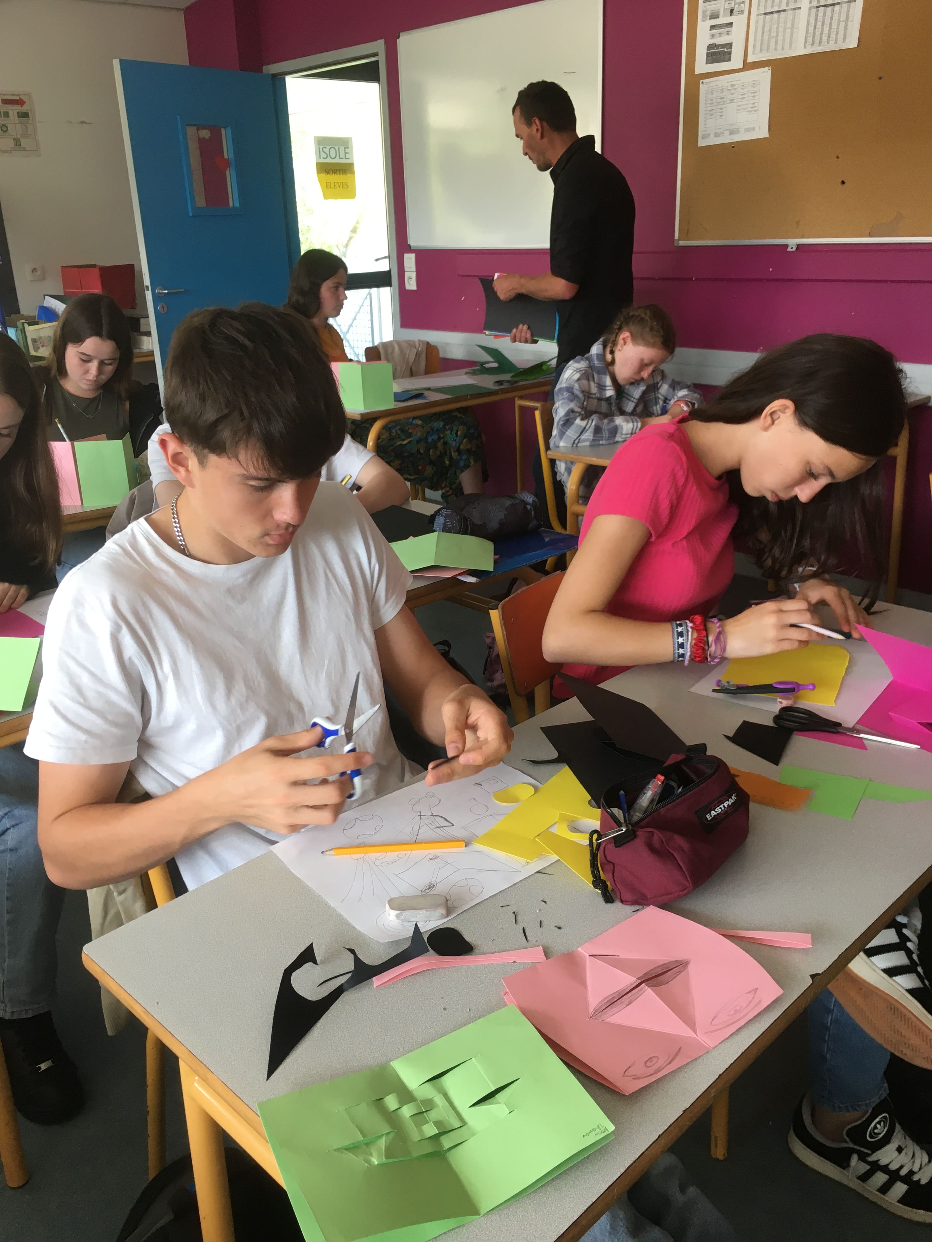 Le temps d'une demi-journée, les élèves de 5e et de 3e ont pu profiter d'un temps d’échange pour en apprendre plus sur son parcours et ses créations pop-up et sculptées, puis ils ont été initiés à l'art du pop-up.
